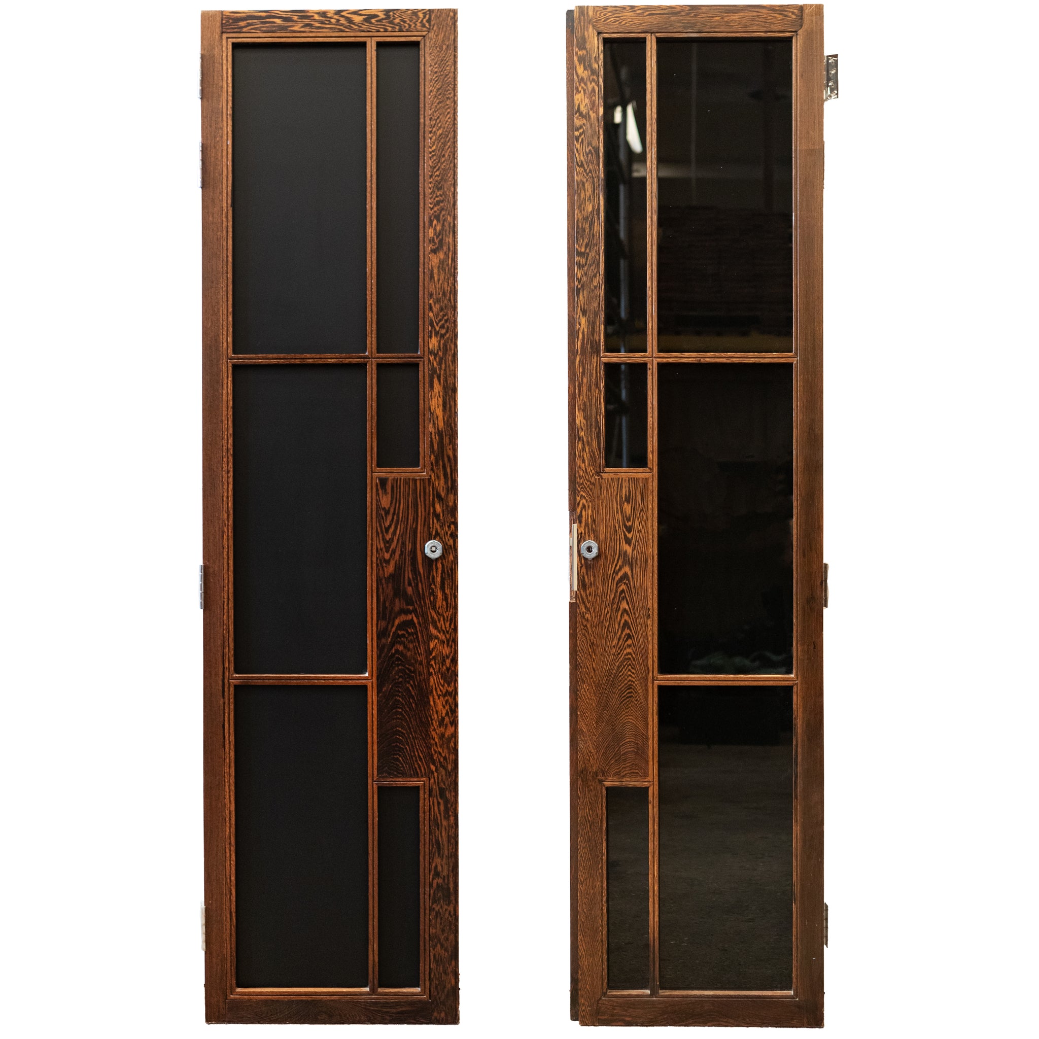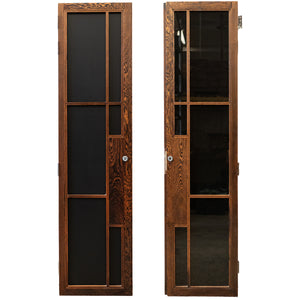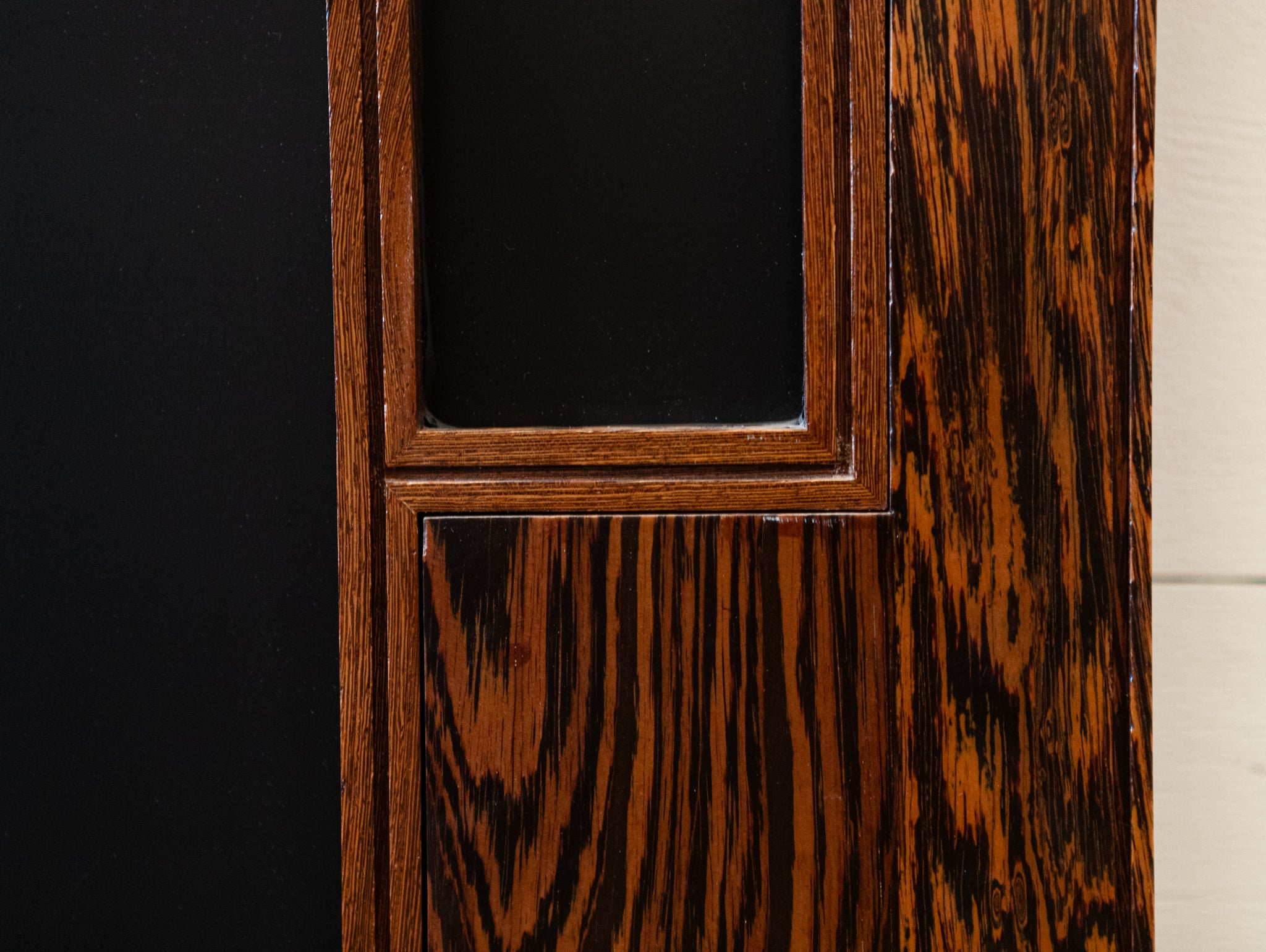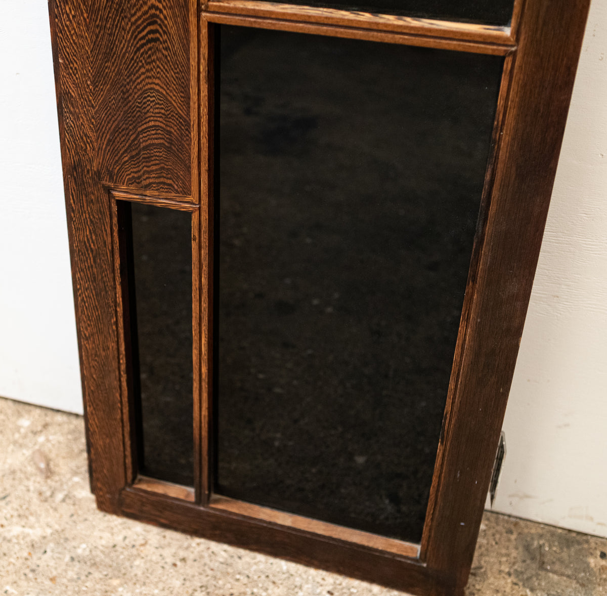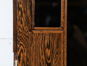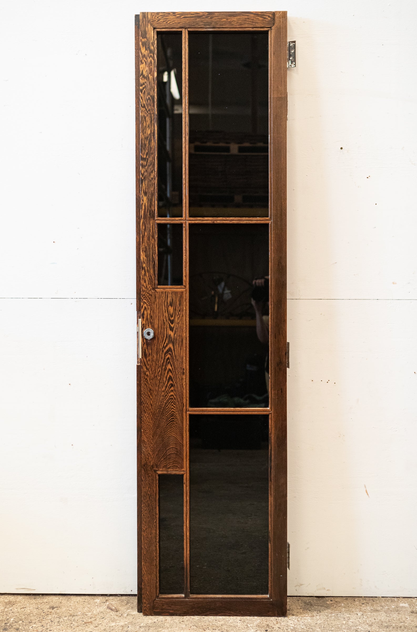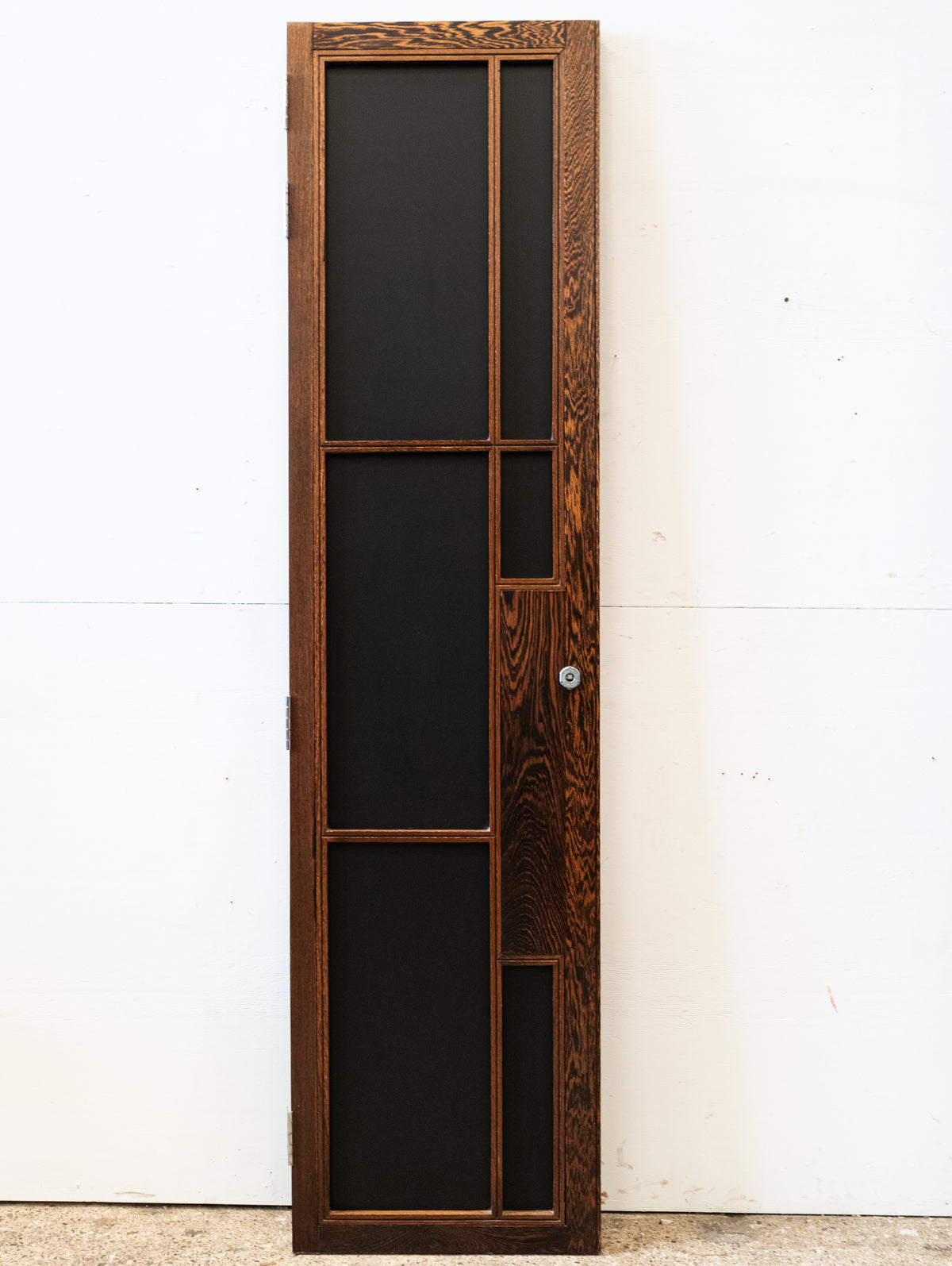 The reclaimed mid-century door, is solid panga panga with black glazed panels.