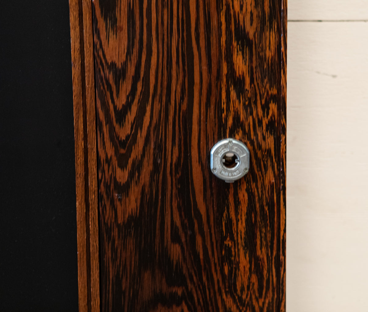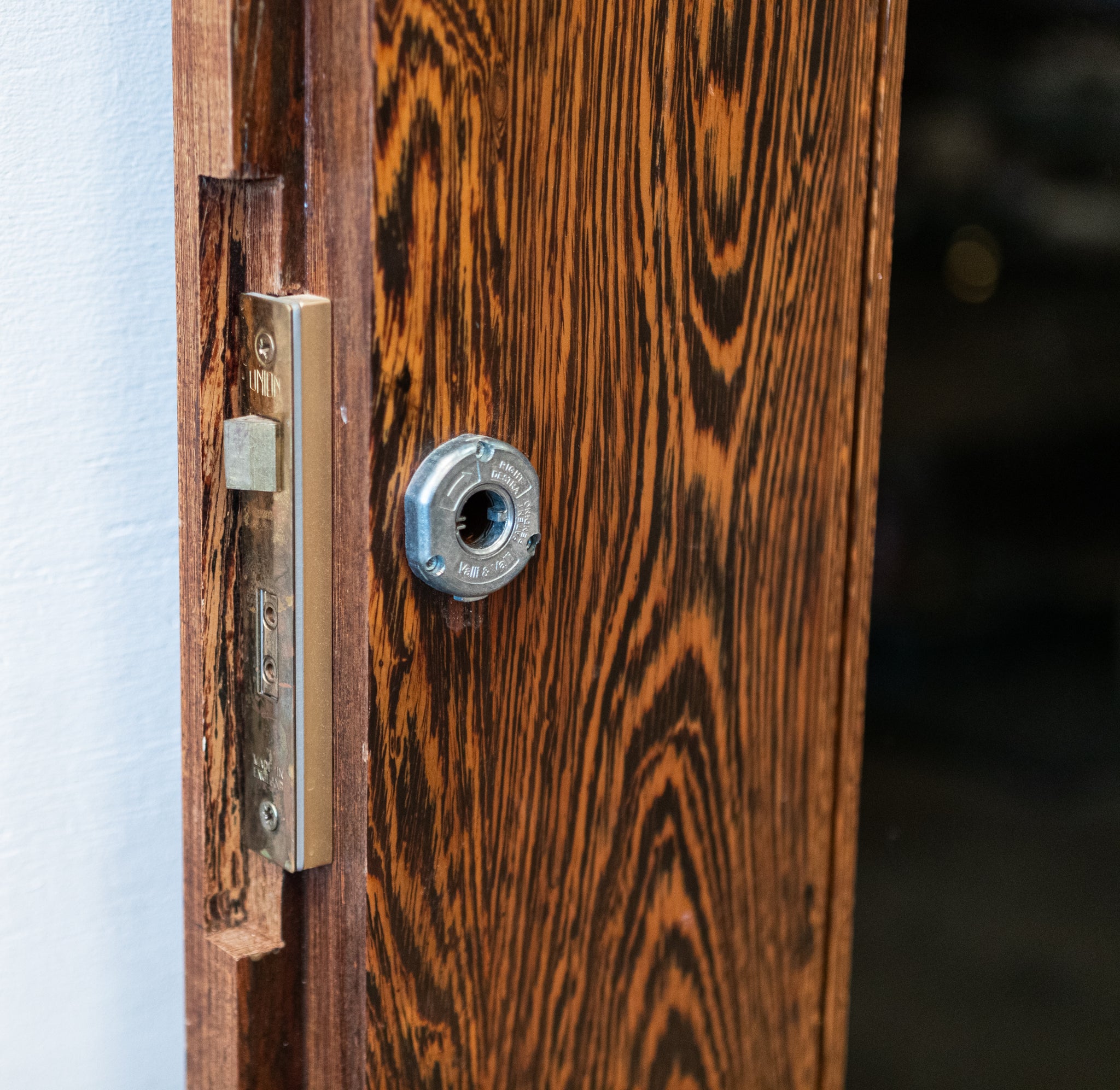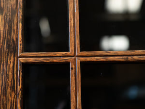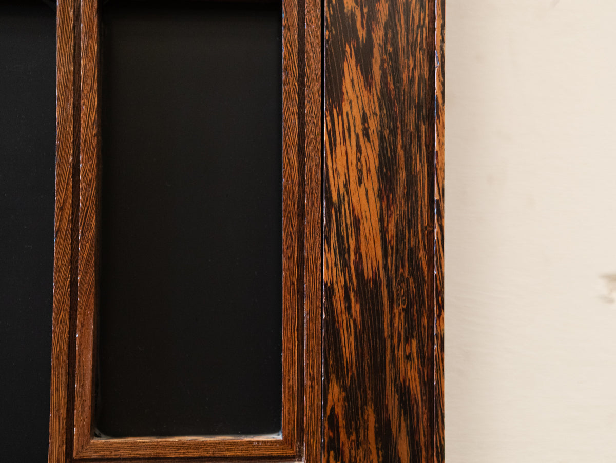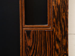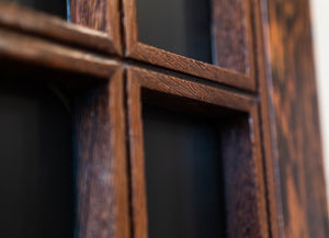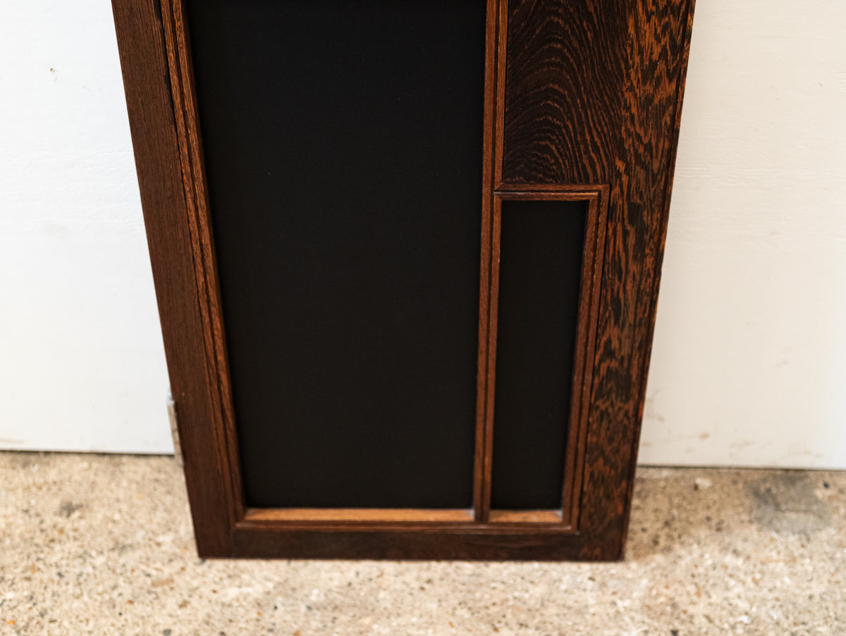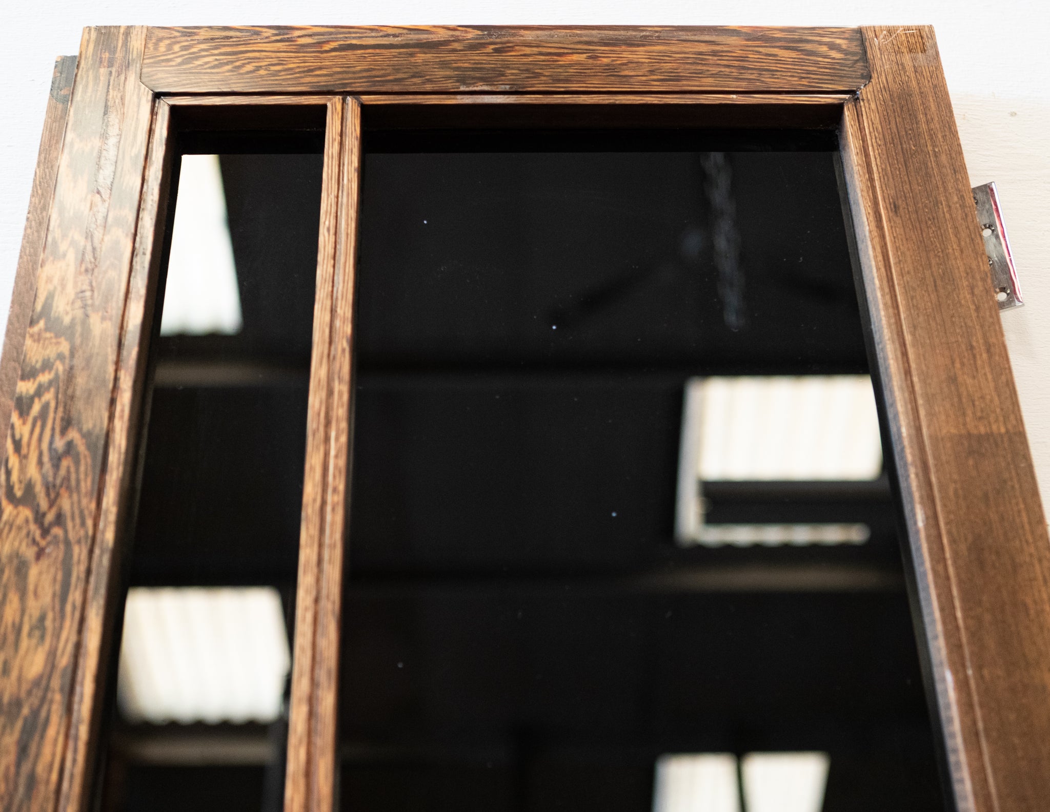 The reclaimed mid-century door, is solid panga panga with black glazed panels.