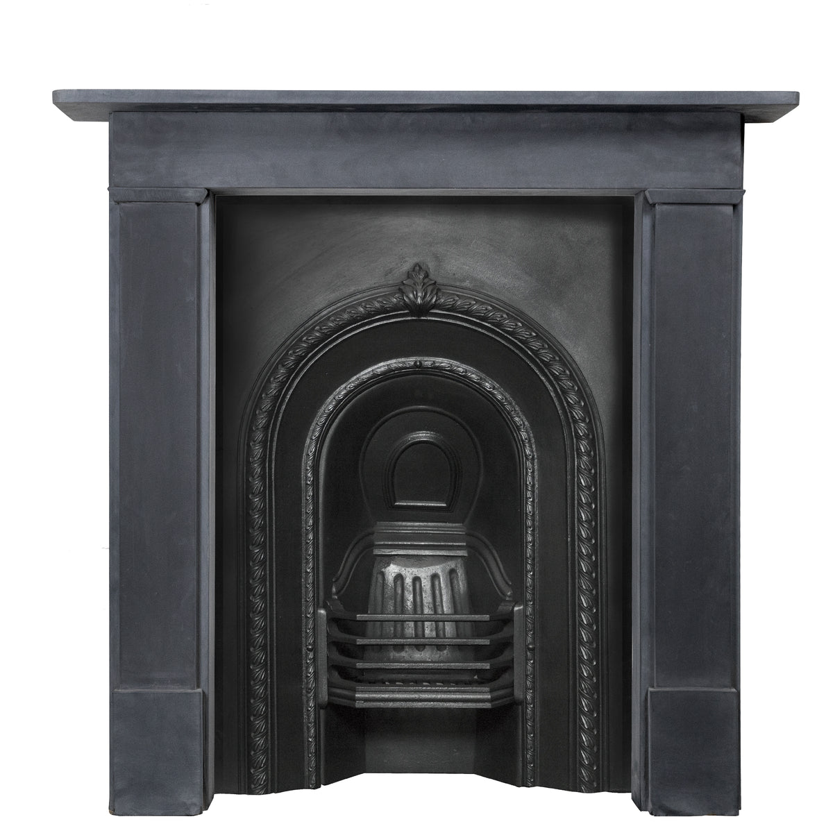 A Victorian-style straight fireplace surround made from reclaimed natural slate.