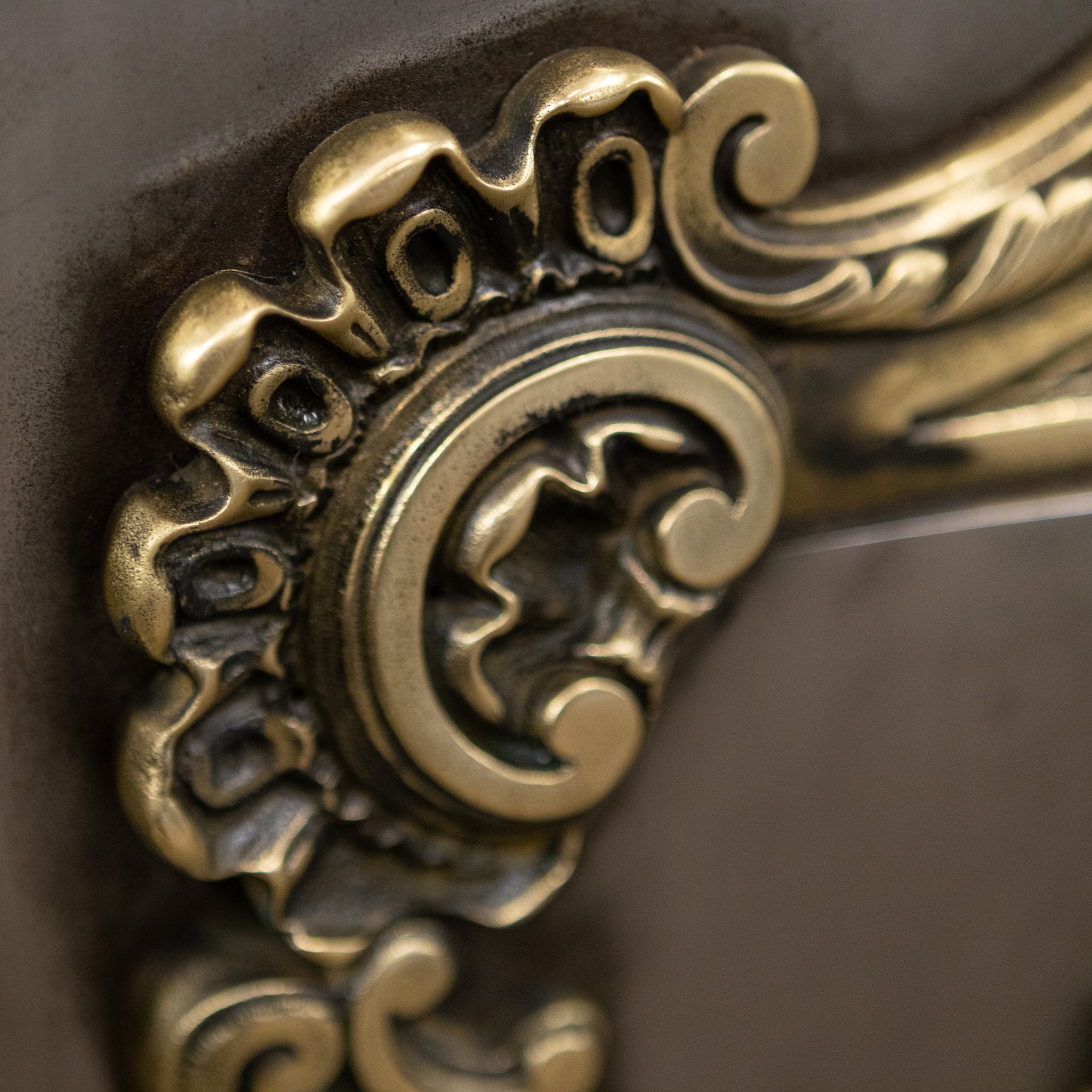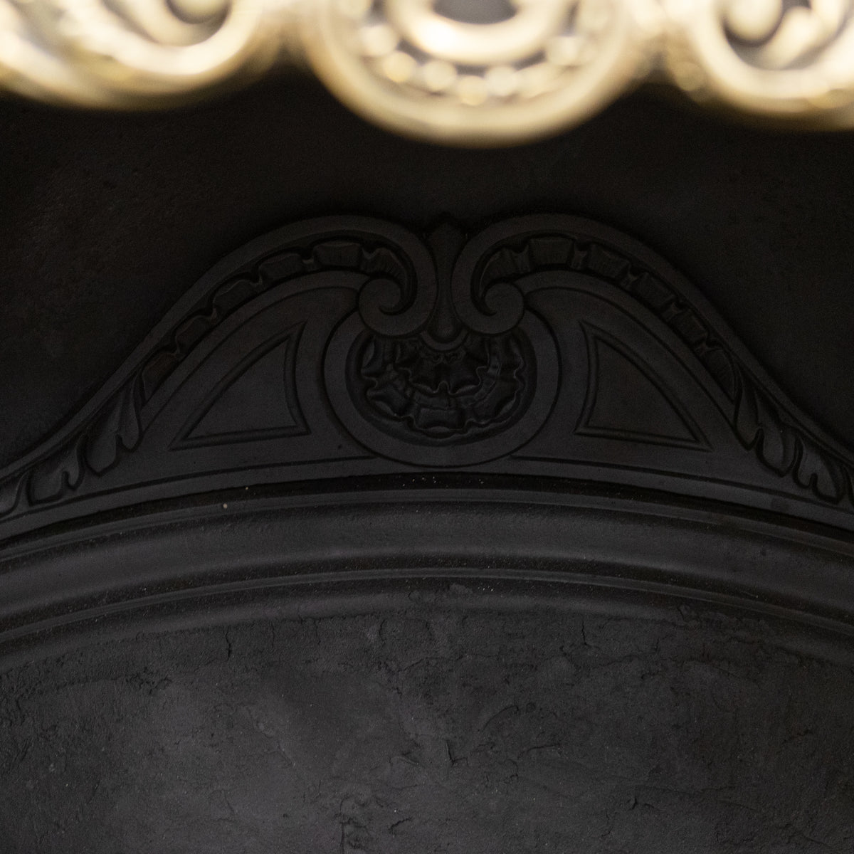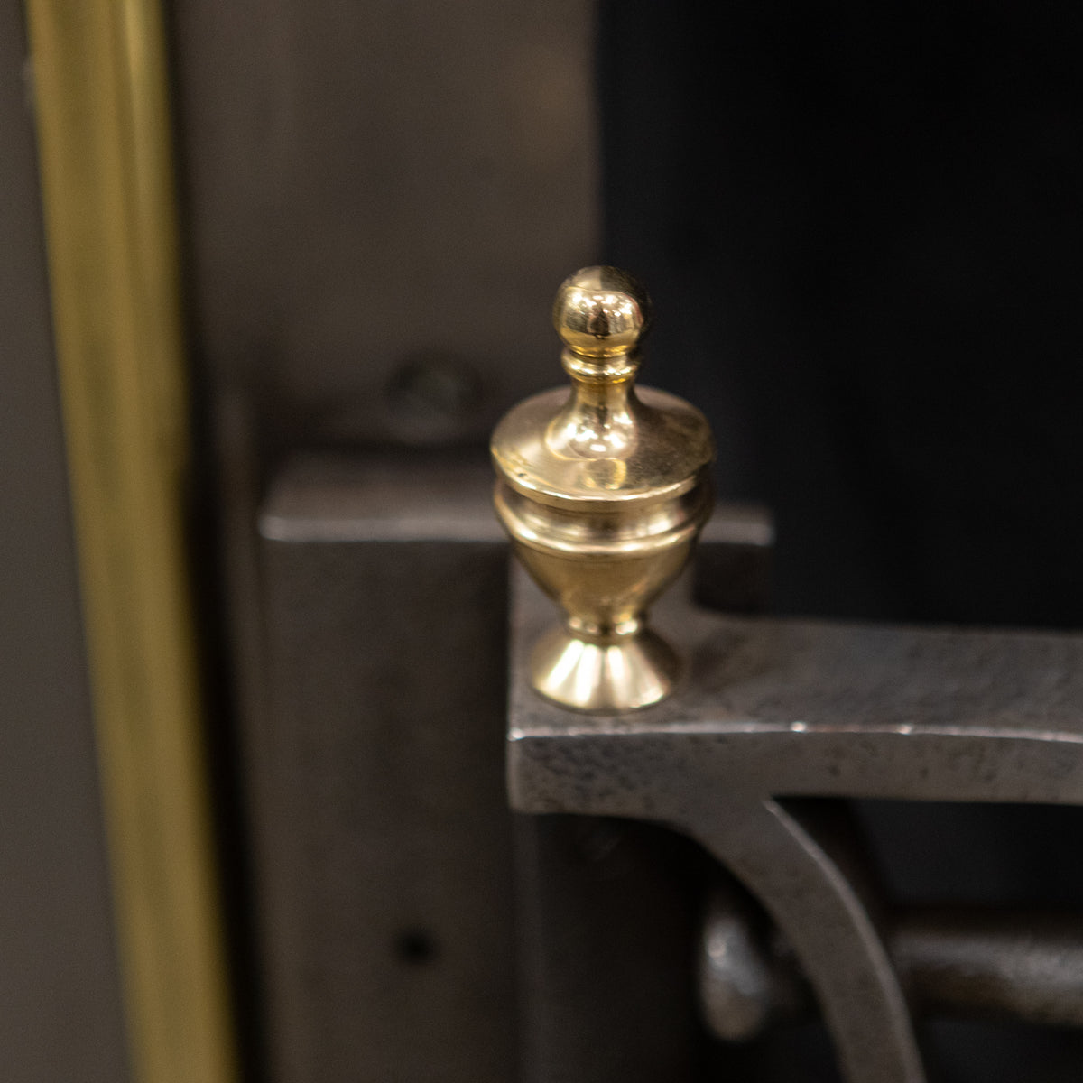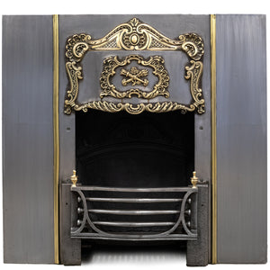 The hood is decorated with deep profile brass motifs, including a pair of overlapping, crossed torches, symbolising enlightenment and hope. The 4 bar integral basket is flanked by brass finials and the backplate is also adorned with an ornate design.