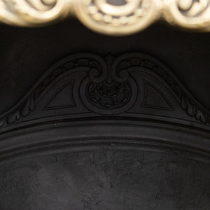 A rare and striking piece, this antique Victorian fireplace insert is composed of polished cast iron with intricate brass detailing to the hood