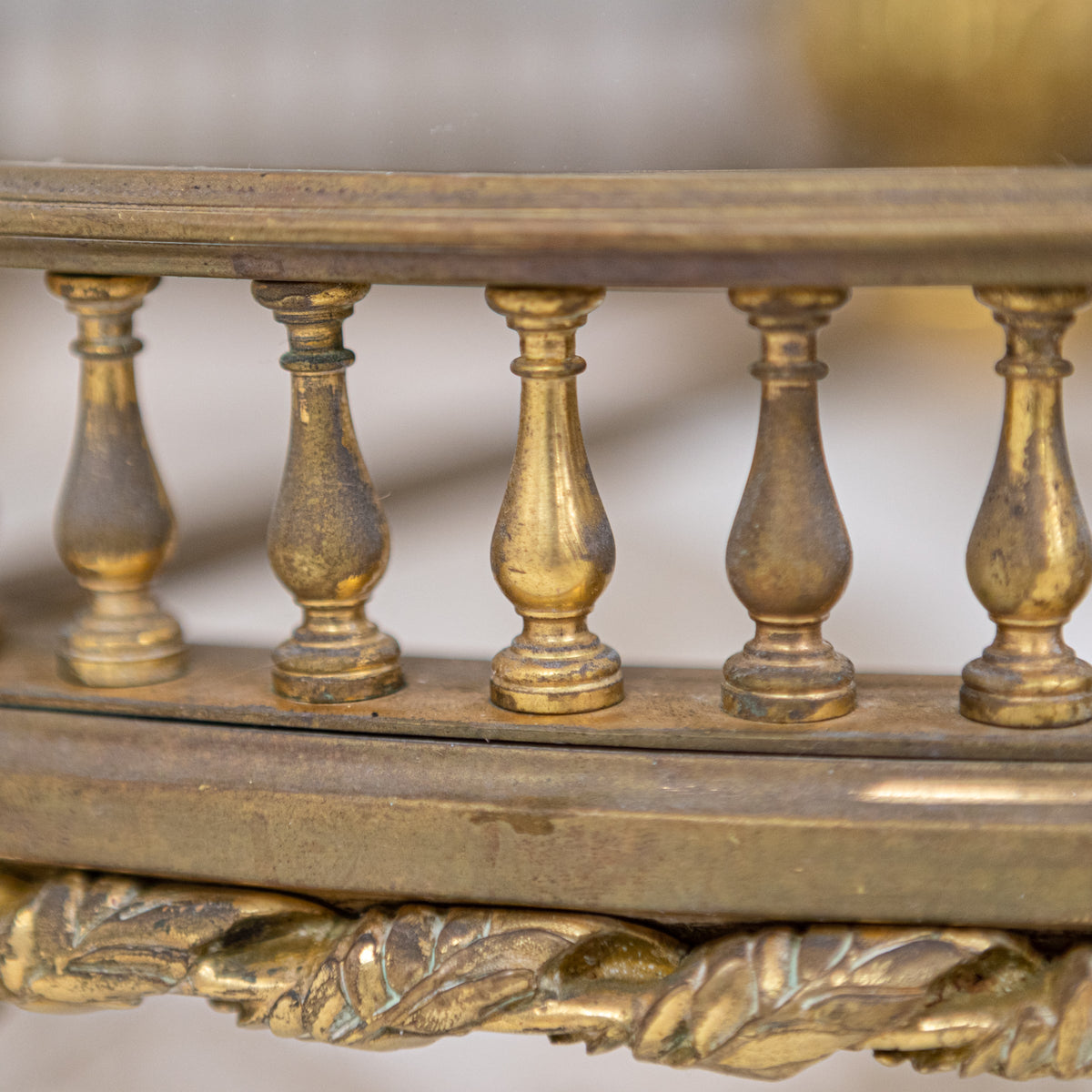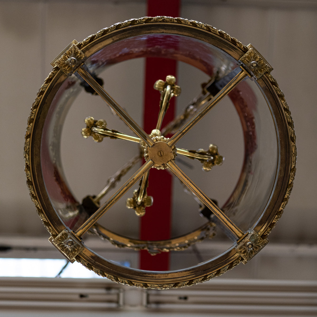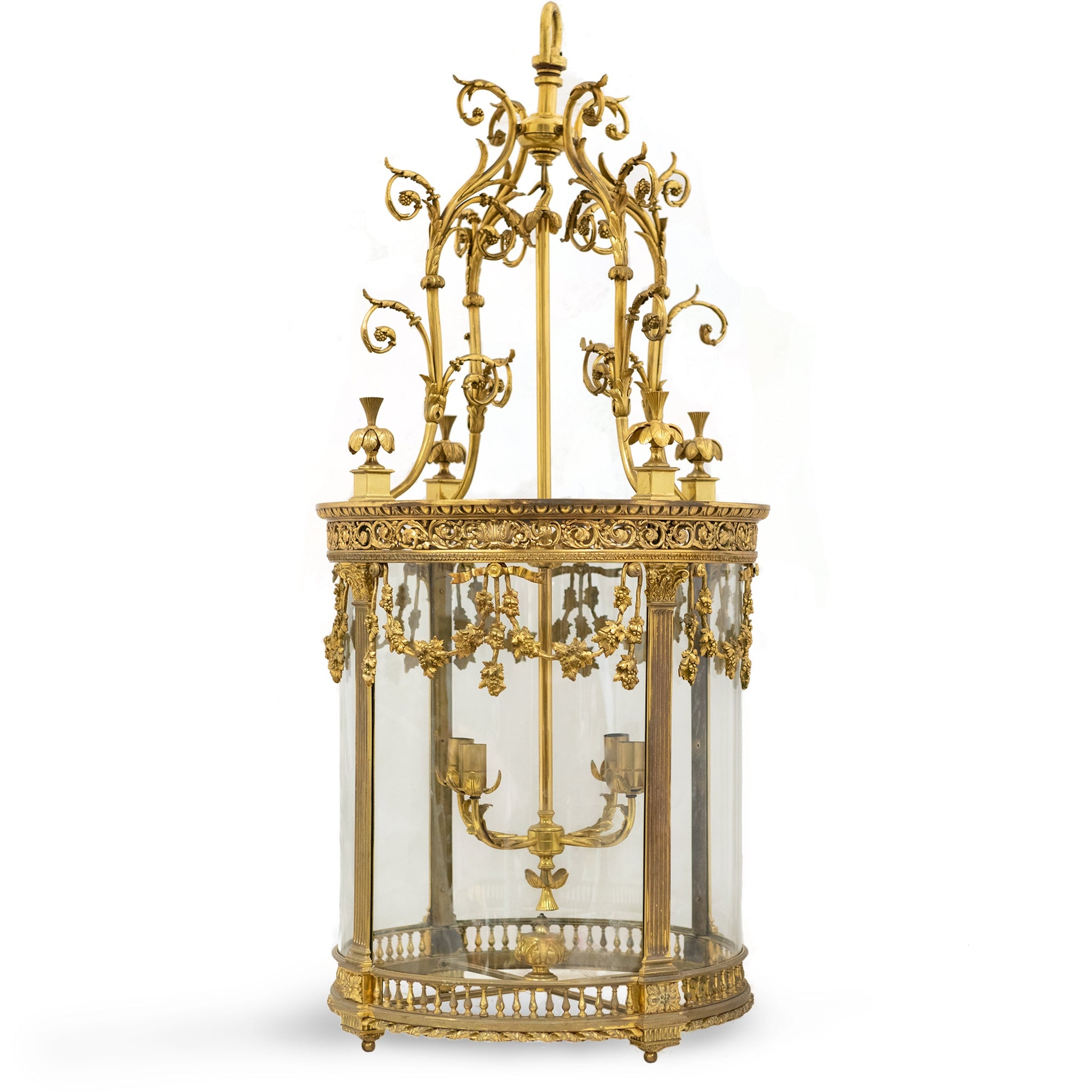 Encompassed in wonderful patination, this reclaimed traditional-style circular lantern has an attractive brass frame that holds four curved glass panels. It has a decorative trim to the base, with the top adorned with more motifs and large leaf-bearing finials. The lantern comes complete with original substantial brass chain and ceiling rose.