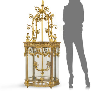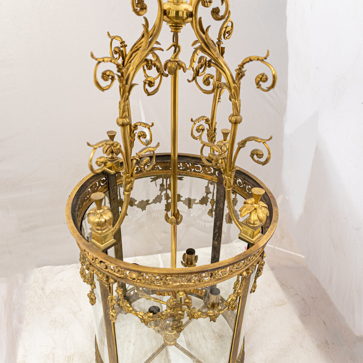 Oozing opulence, this spectacular large, brass lantern has intricate detail throughout featuring delicate florals, acanthus leaf framework and scrolling foliate motifs.