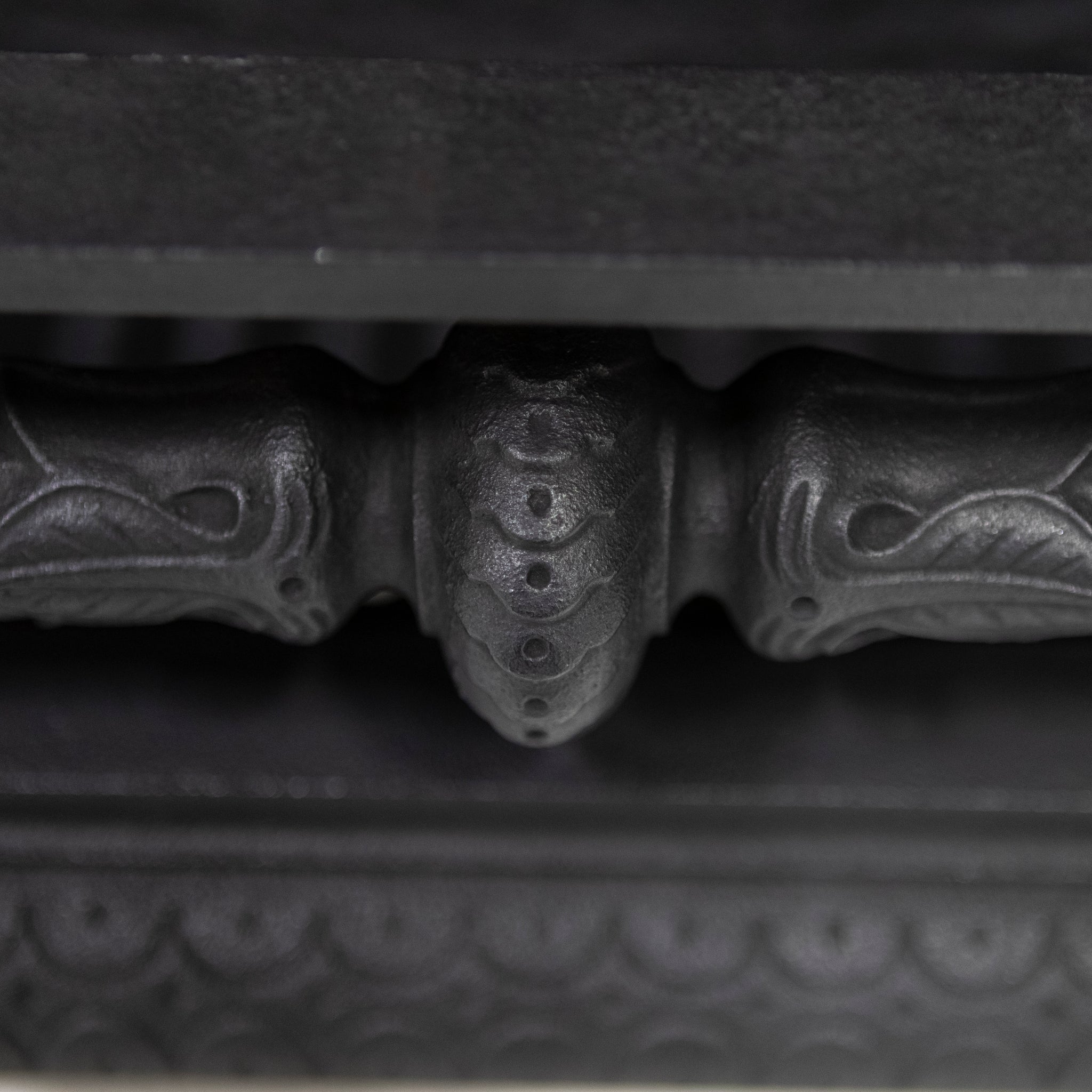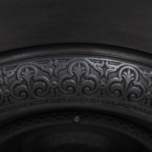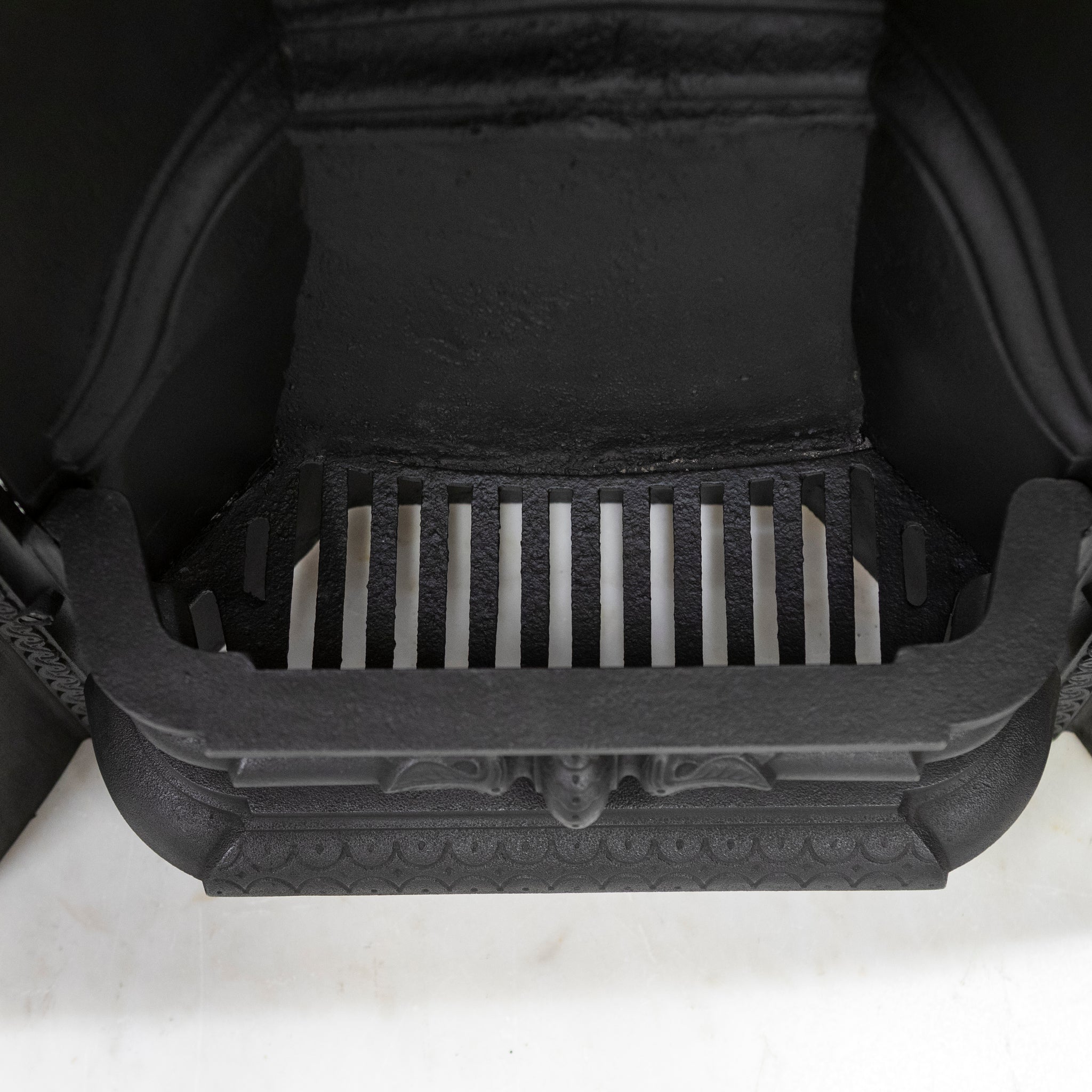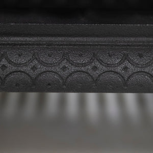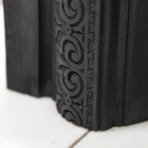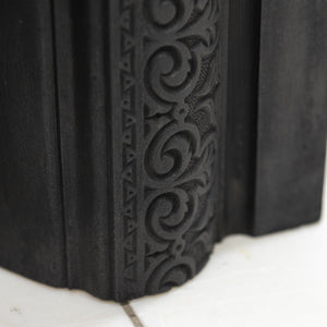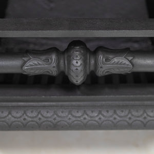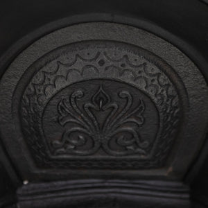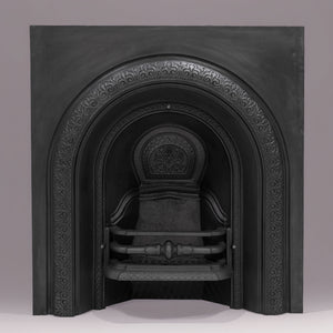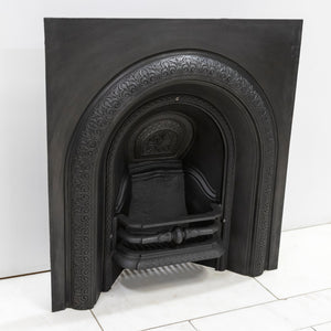 Antique Cast Iron Arched Fireplace Insert with an arched opening and large ornate cushioned border.