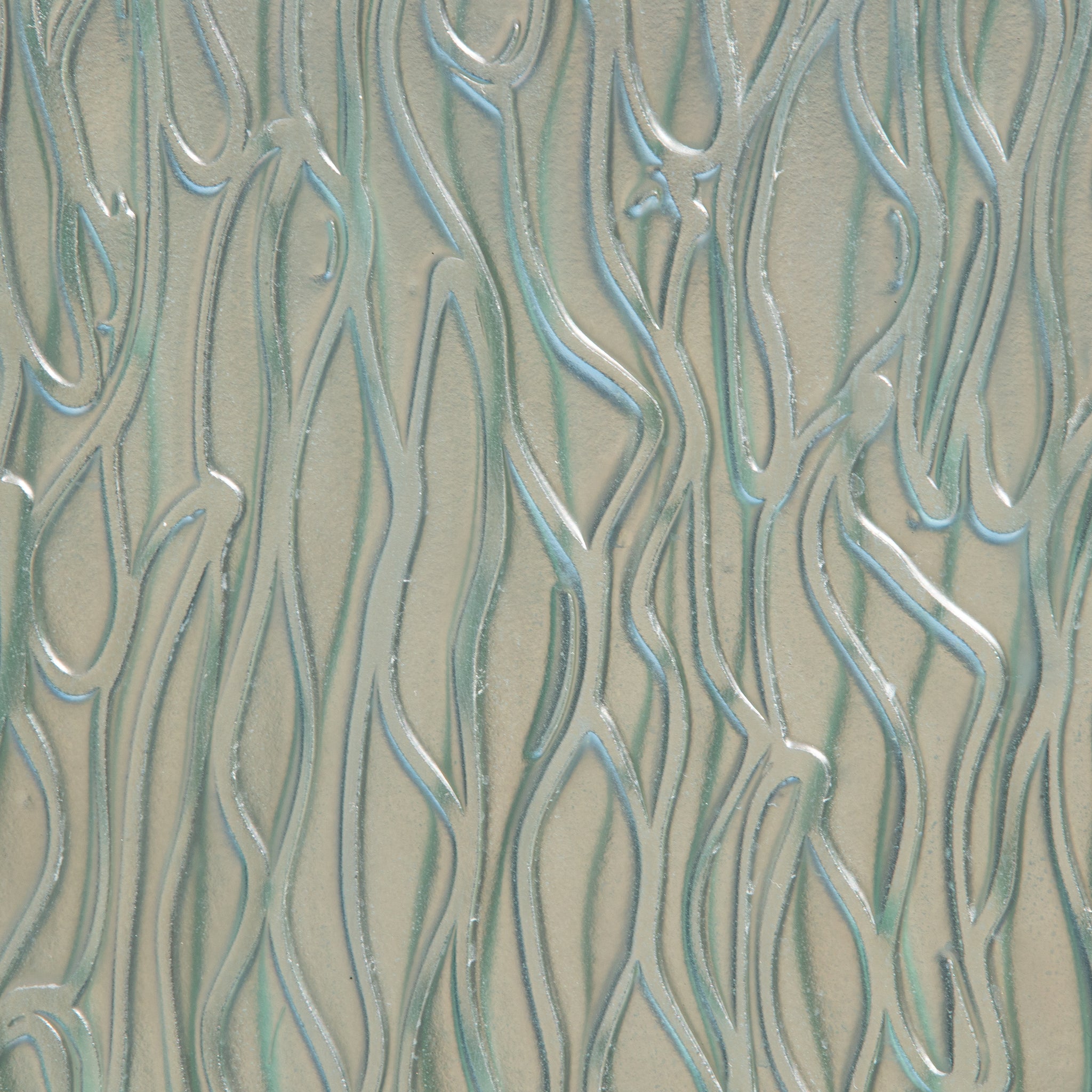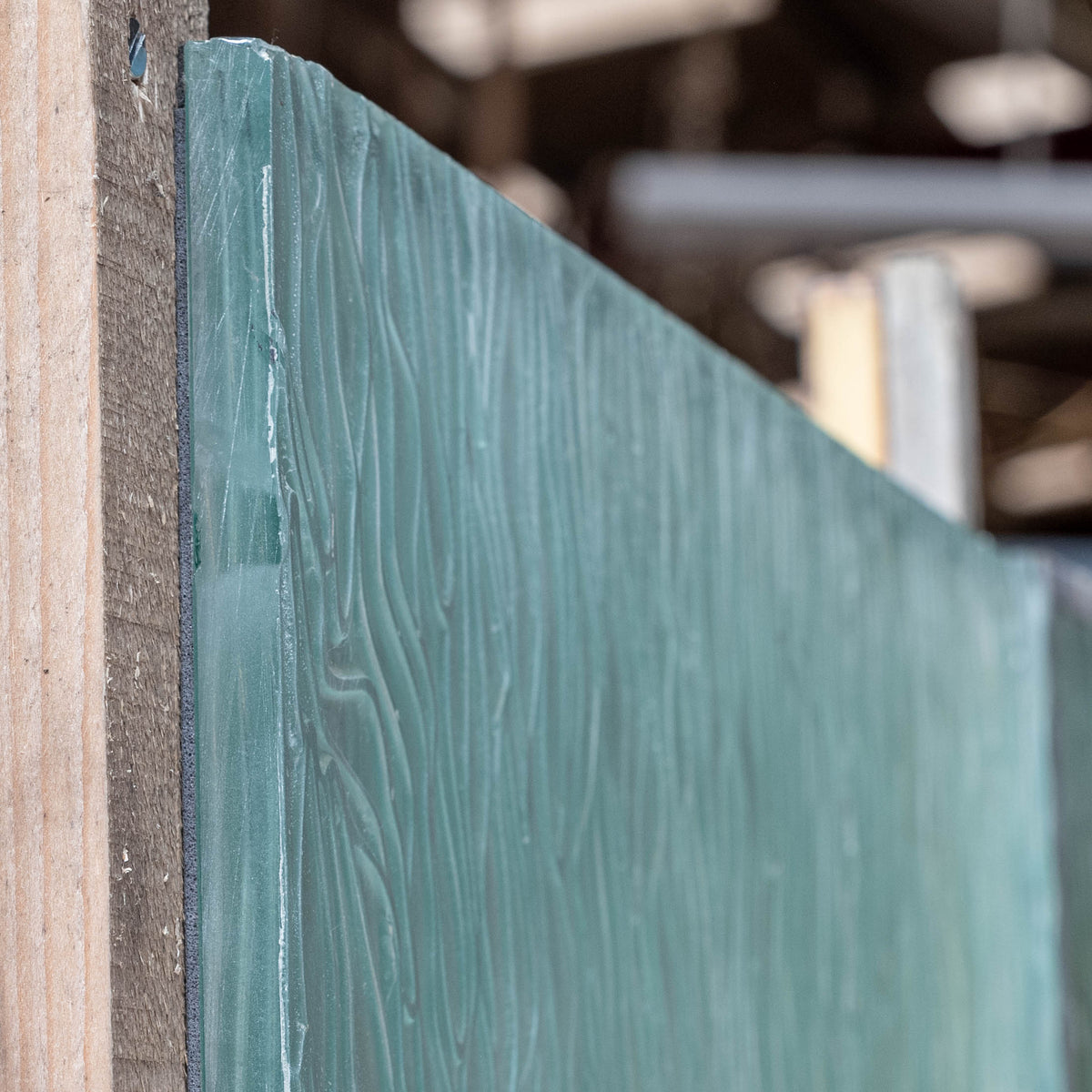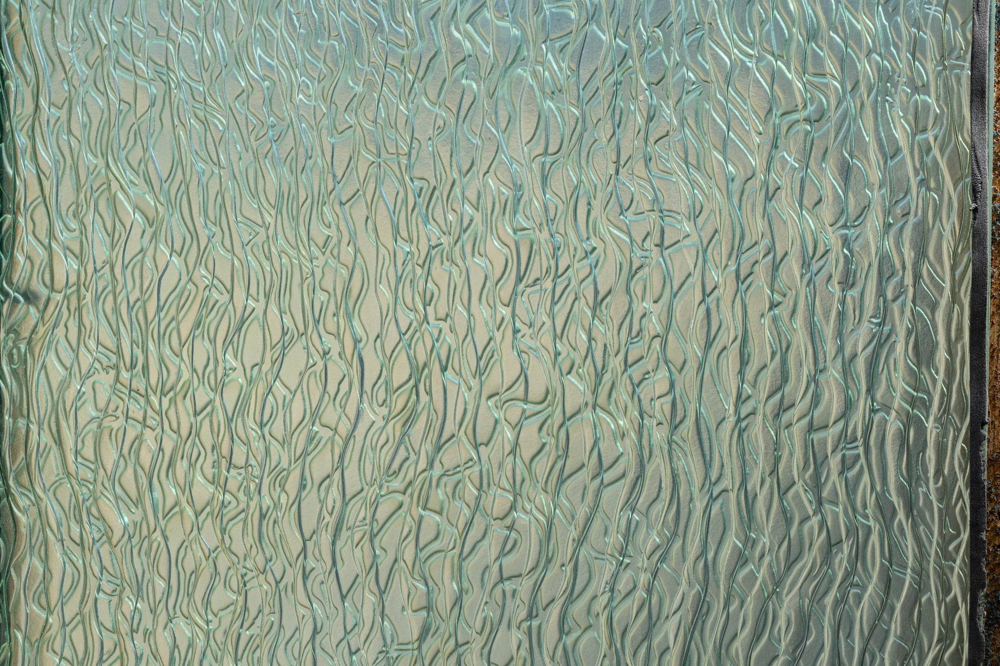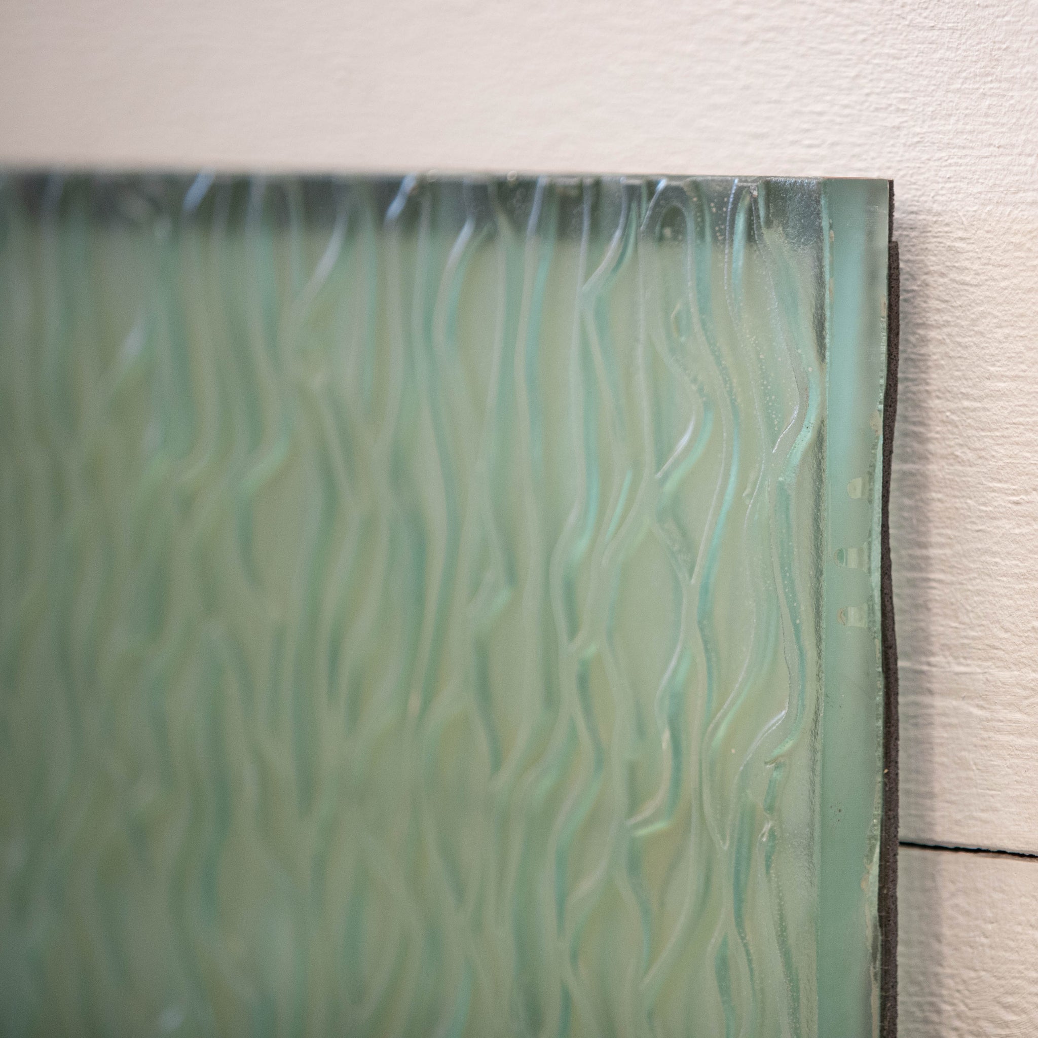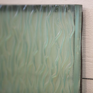 The glass has a beautiful tint of green. When light passes through the panes the result is striking. The glass has a subtle frosted finish offering privacy.