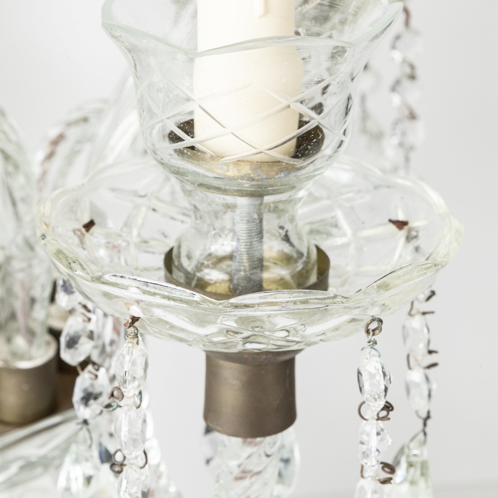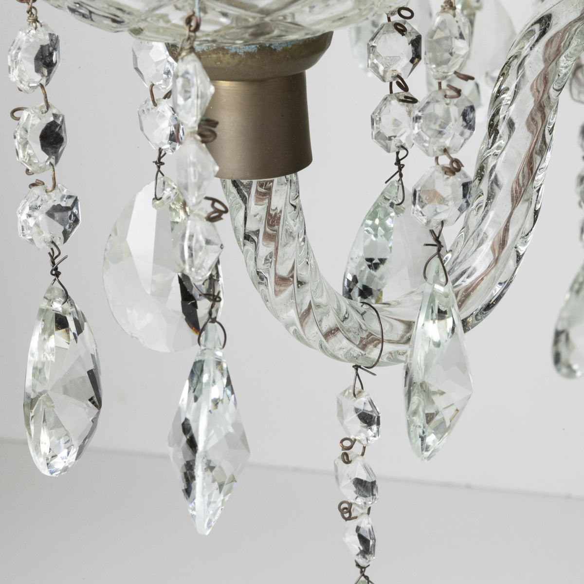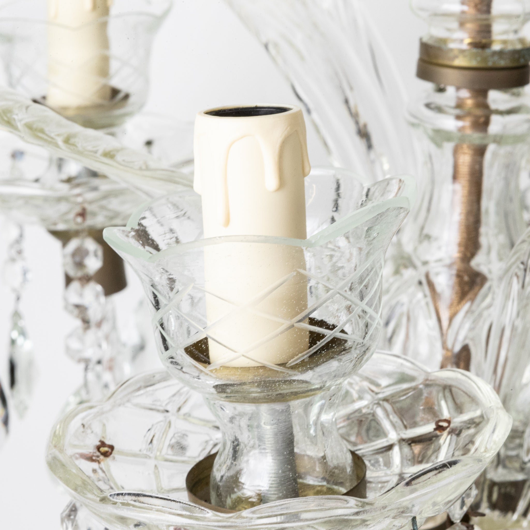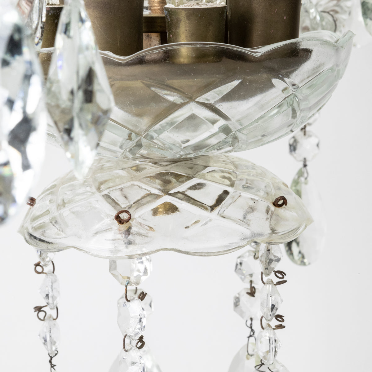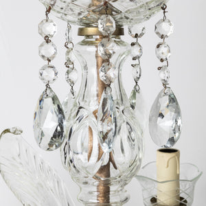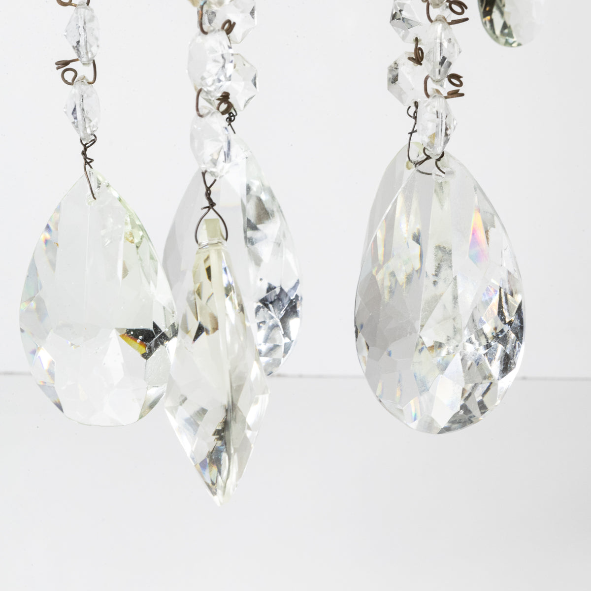 Between each of the 4 arms is a leaf. Crystal drops suspend from each bobeche.