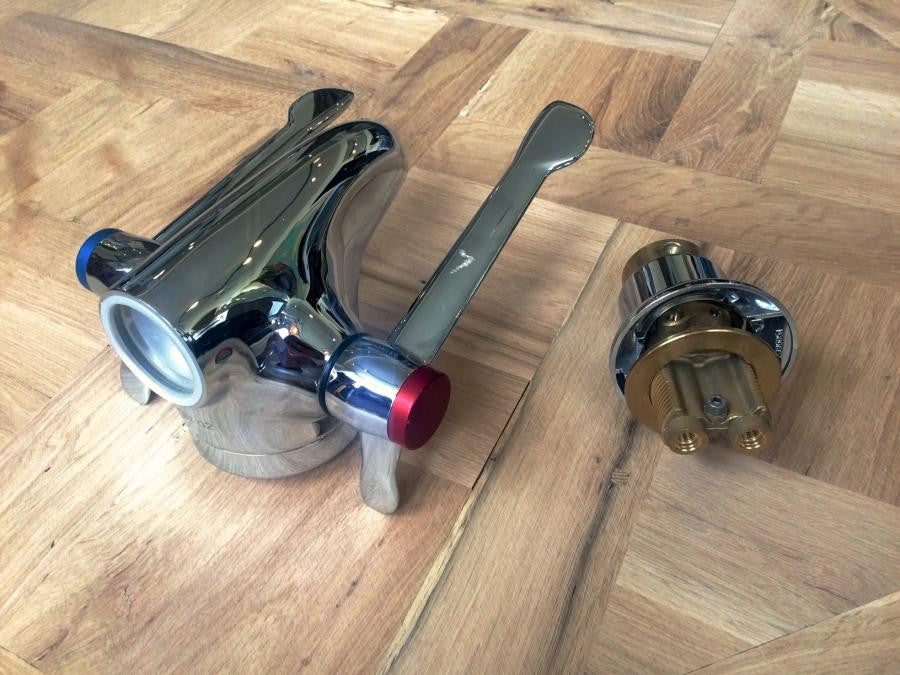 A heavy duty thermostatic mixer tap in chrome. This reclaimed retro wall mounted tap features sleek and long lever handles, with opposing red and blue coloured disks on either side of the handles.