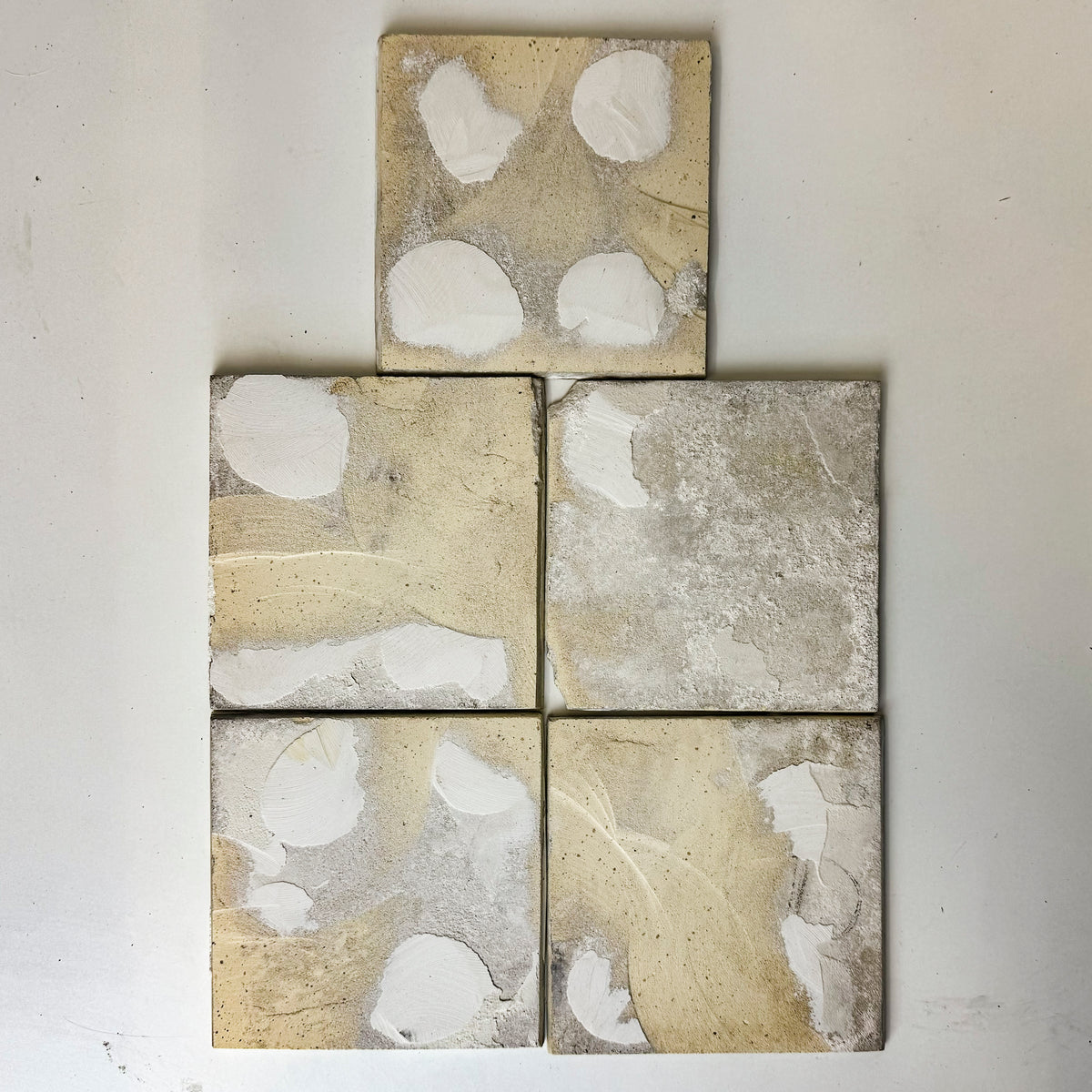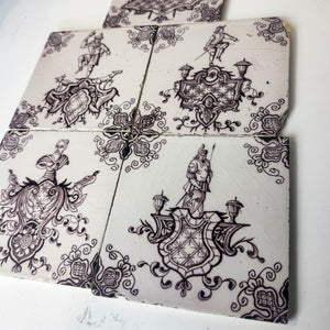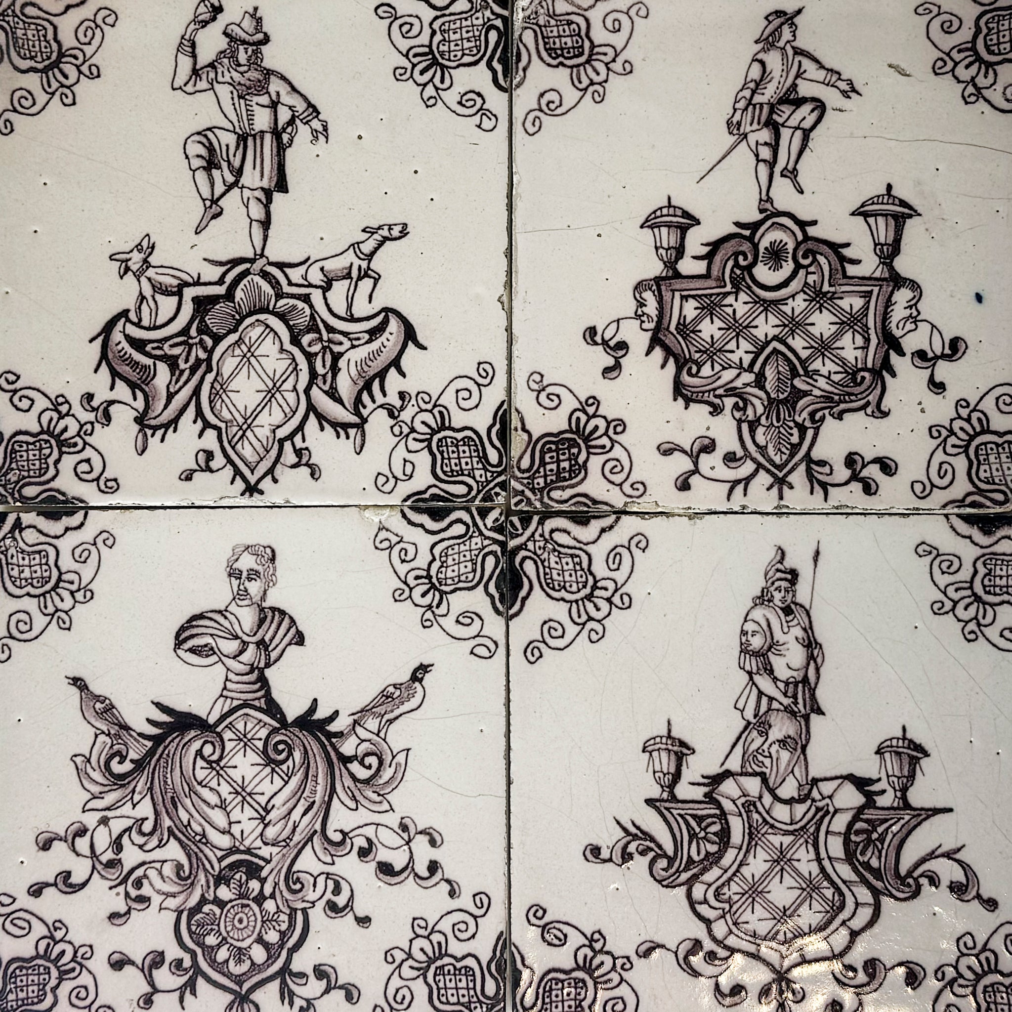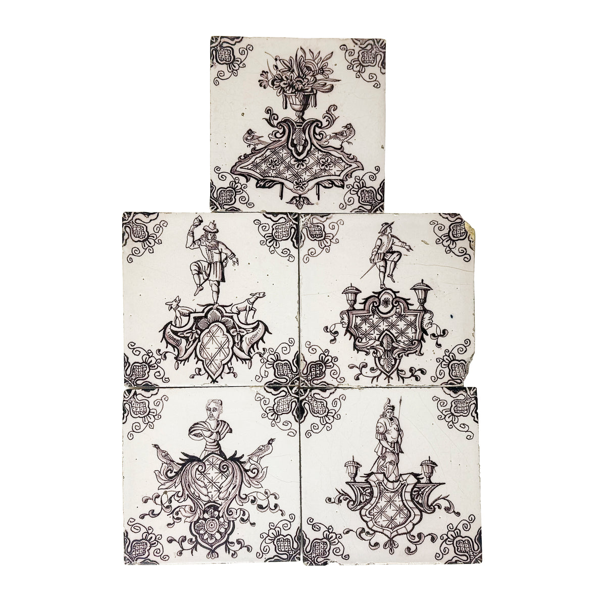 A set of five 18th century Manganese Dutch Delft tiles. Known for their intricate brown and white designs, these tiles feature beautiful designs of a combination of flowers, animals and figurines.