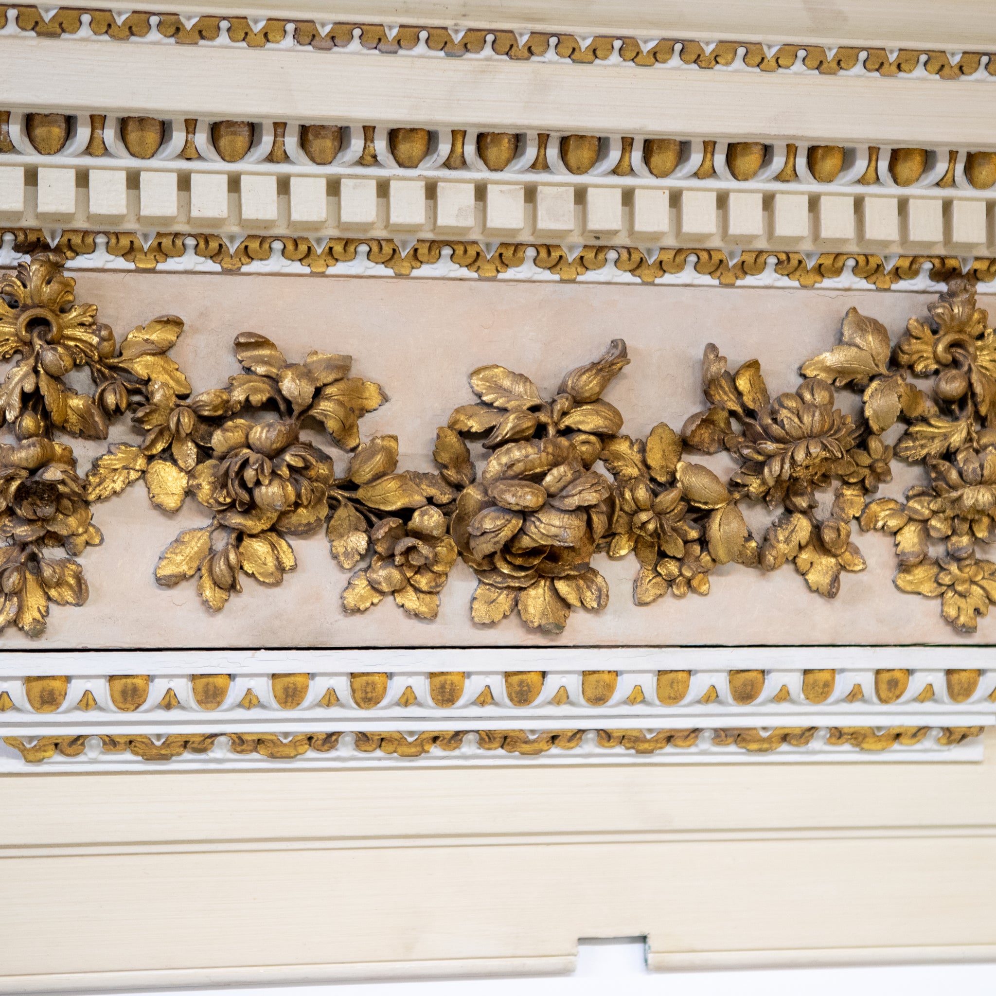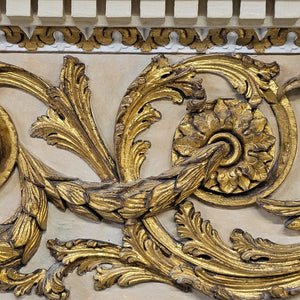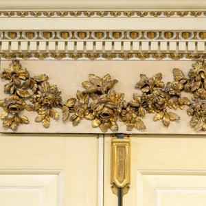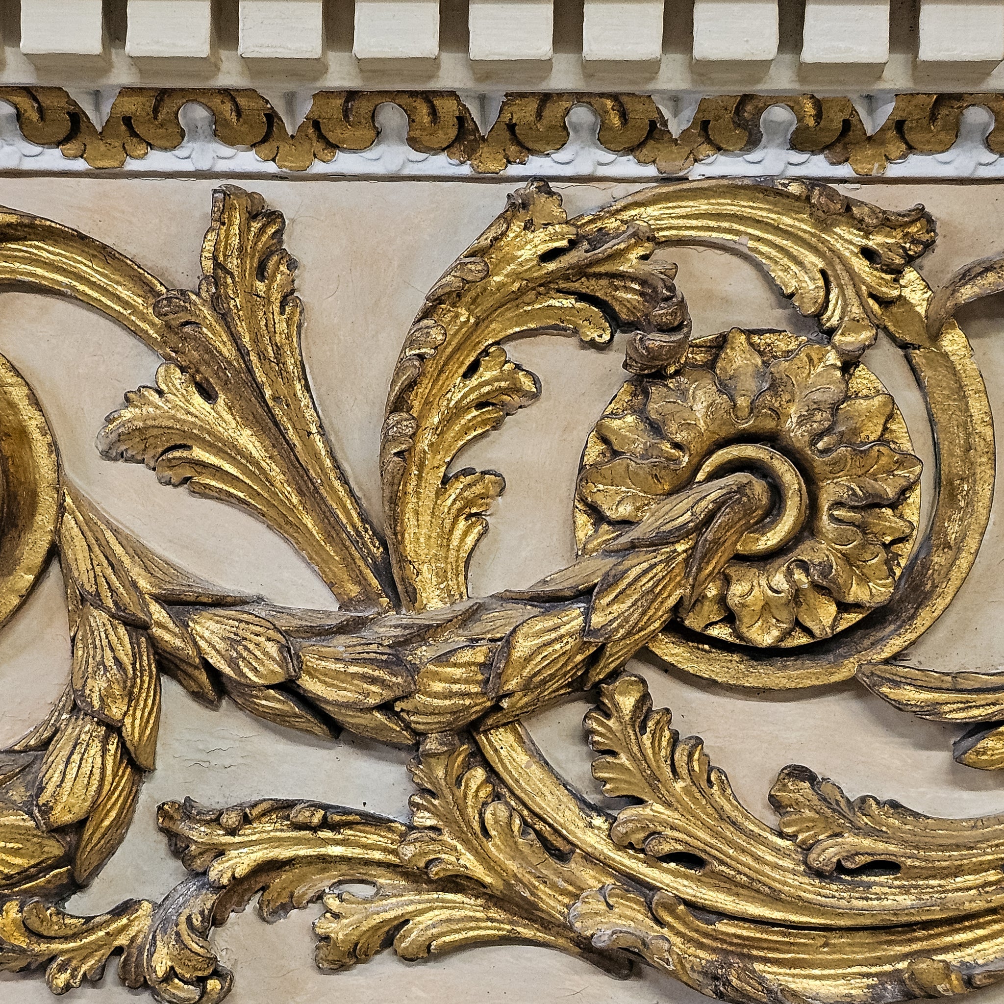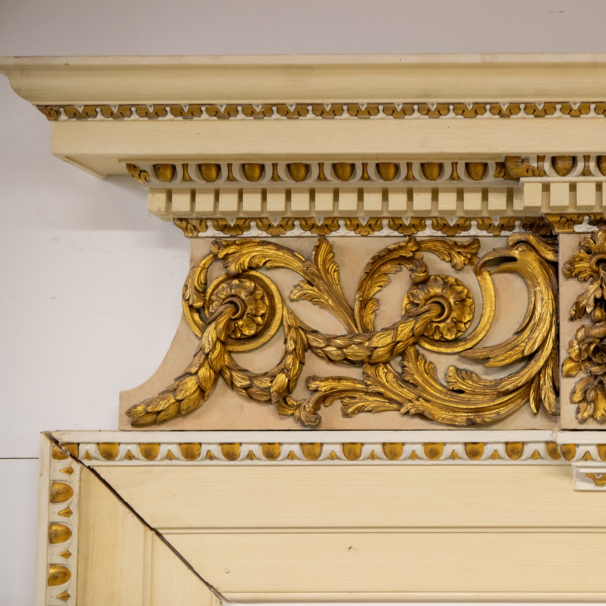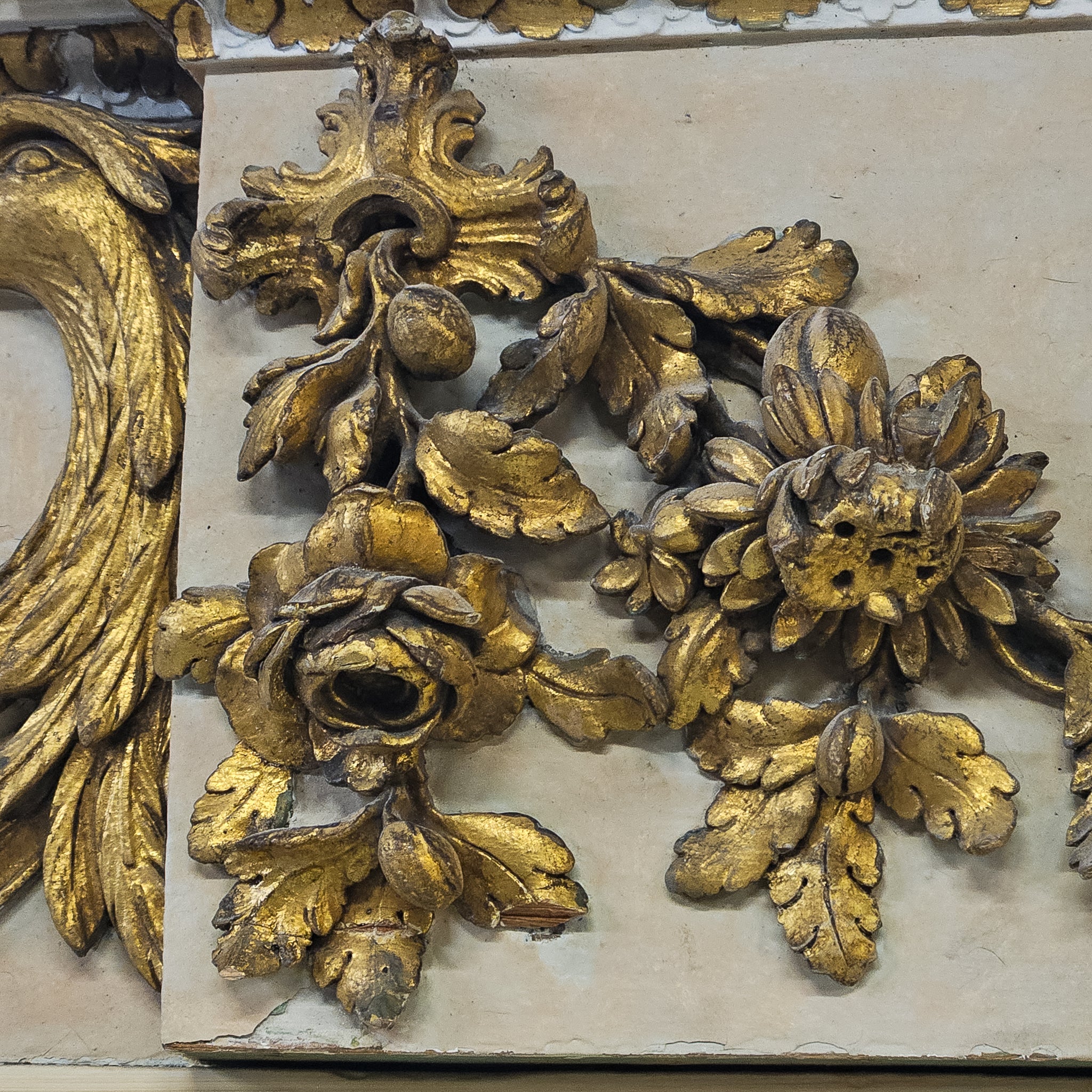 The pediments are the standout— Very deep profile with finely detailed neoclassical ornament, including scrolling acanthus, florals, eagle-head terminals and dentil moulding beneath a deep projecting cornice. They carry the quality and depth of carving expected of the Georgian period, with a strong architectural presence suited to formal interiors.