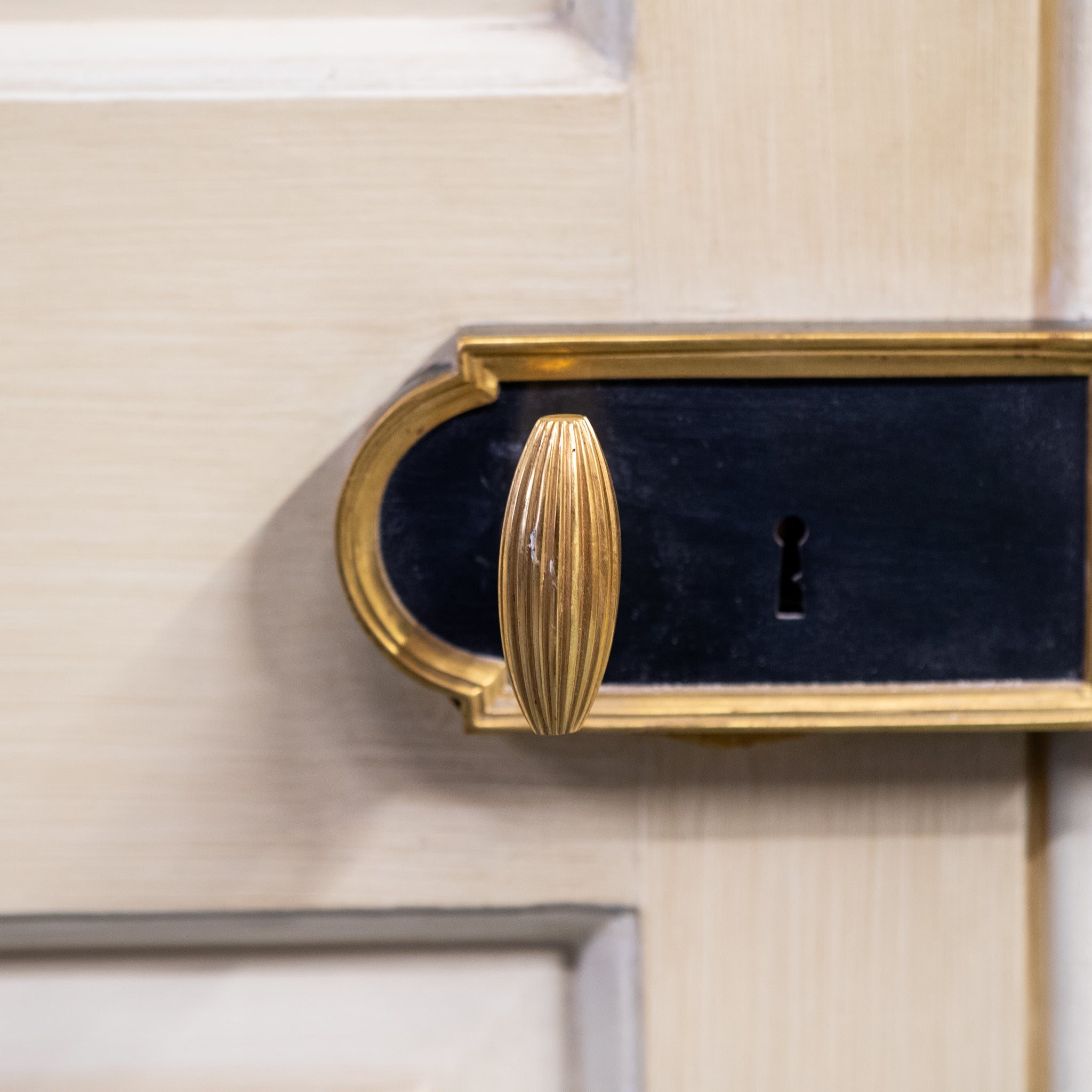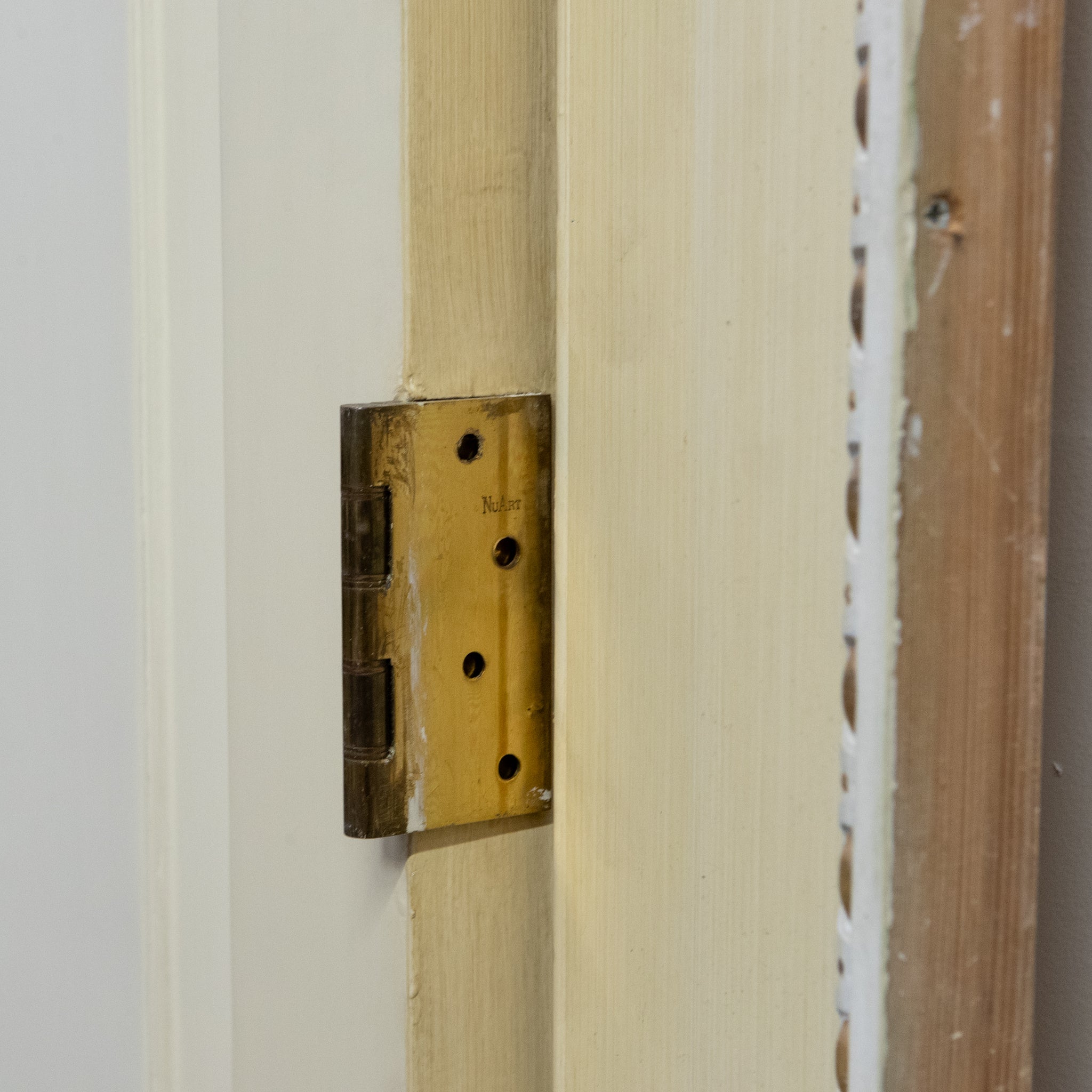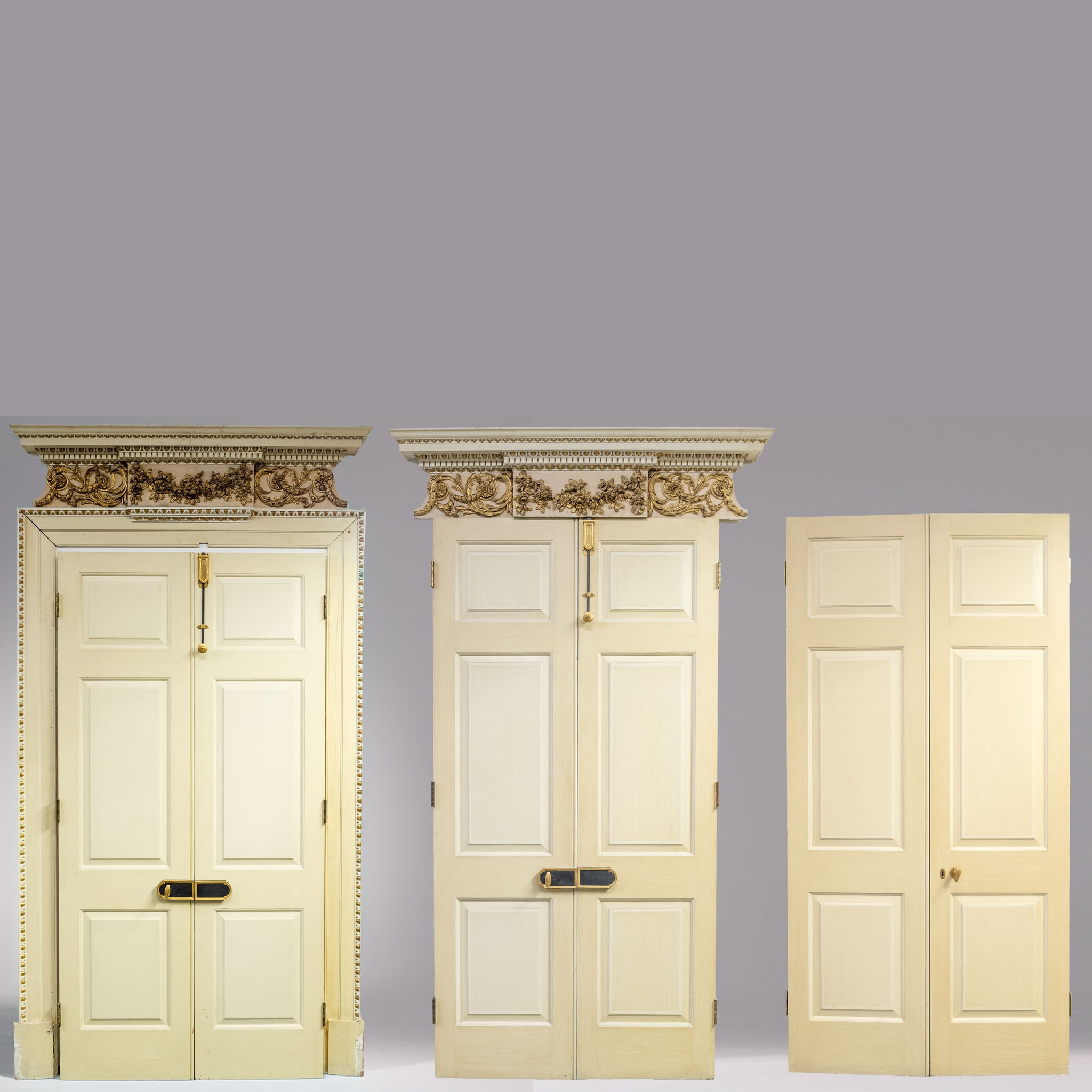 One set retains a full architrave (early 20th century), simple and restrained in comparison, allowing the pediment to remain the focal point.
