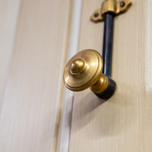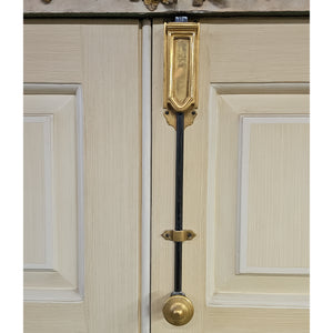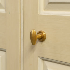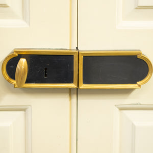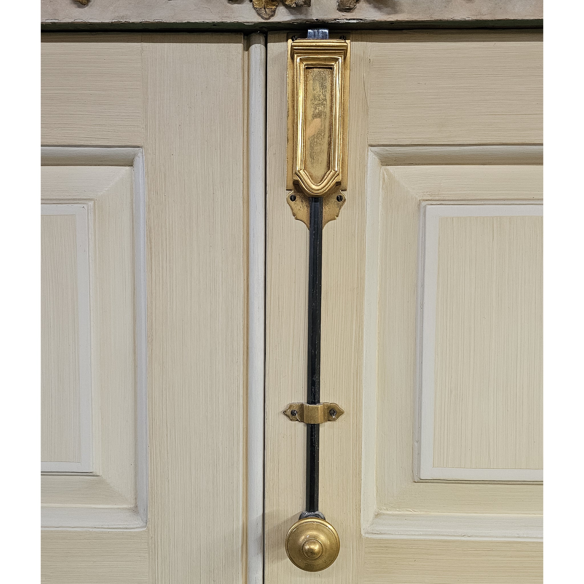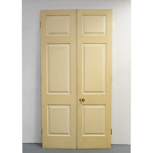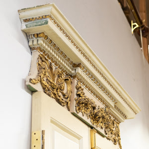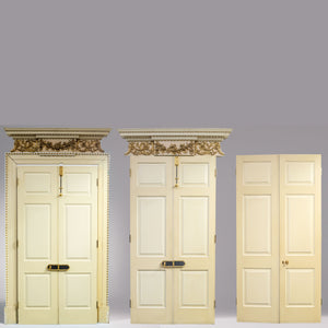 The doors themselves are later, likely late 19th to early 20th century, with clean six-panel configurations and good proportions. They sit comfortably beneath the pediments without compromising the impact of the earlier decorative elements.