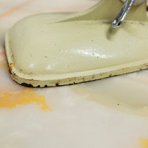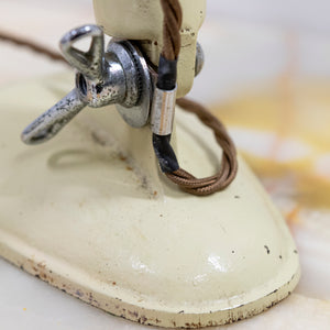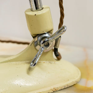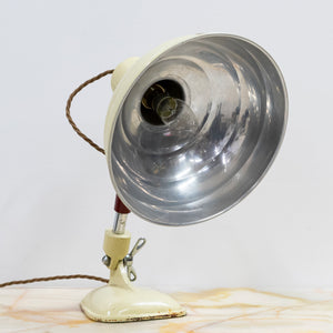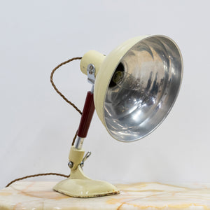 Finished in a soft cream enamel with polished aluminium reflector, the lamp features a fully adjustable articulated arm with red bakelite sleeve and an original twisted brown flex. The weighted base gives excellent stability, while the reflector can be angled precisely, making it as functional as it is sculptural.